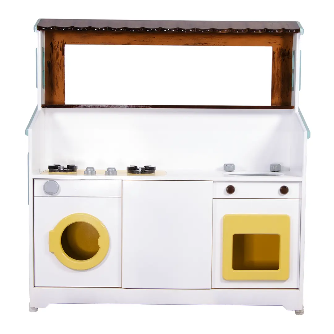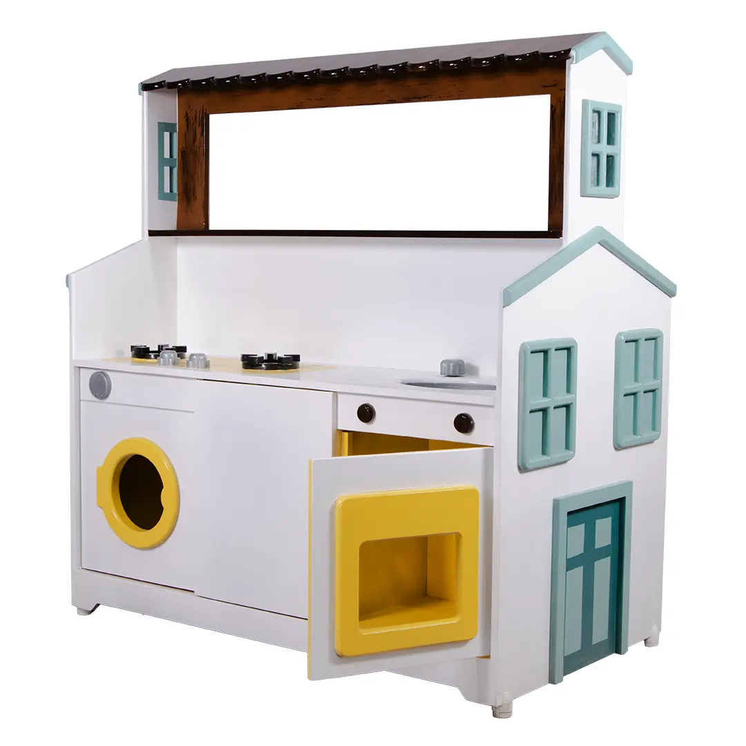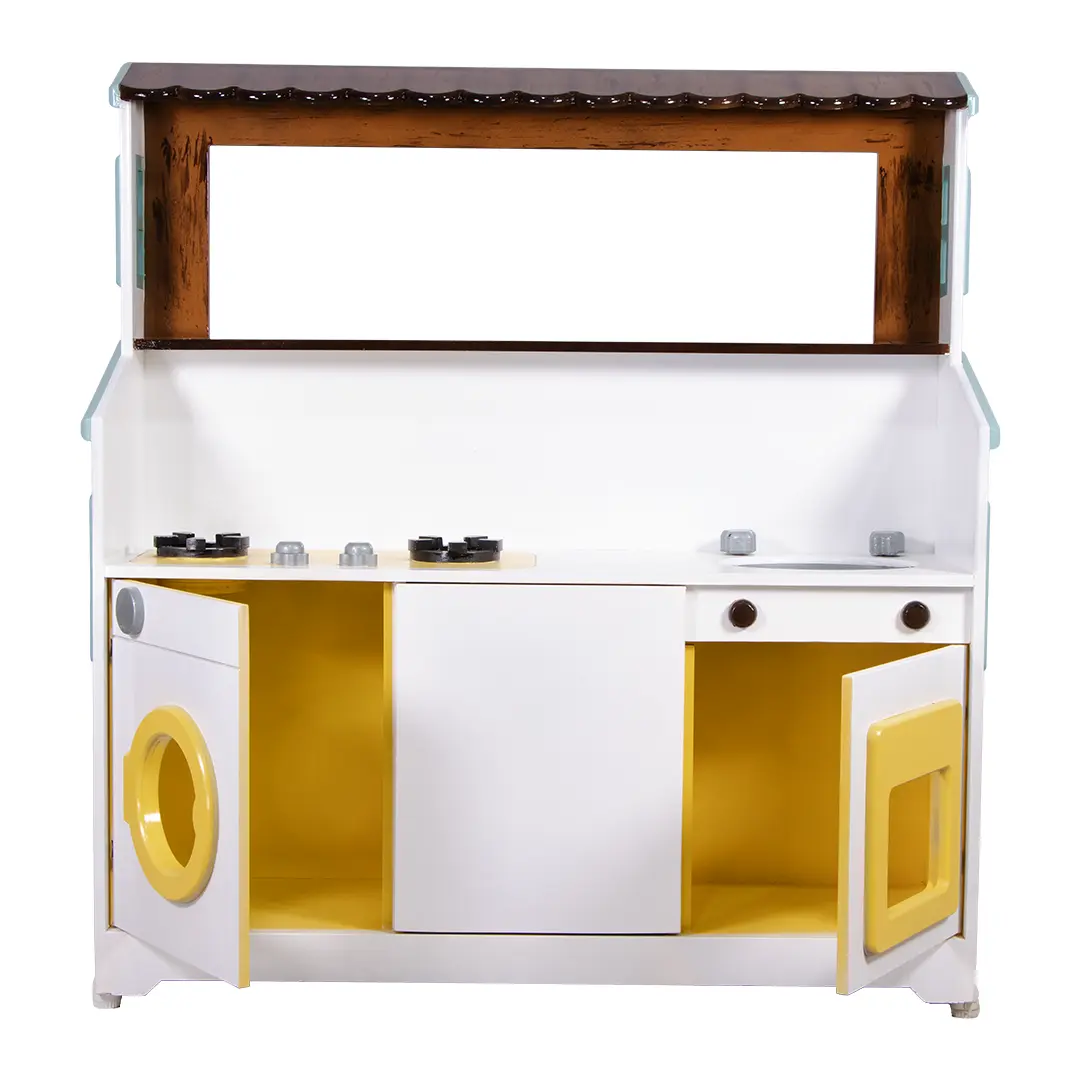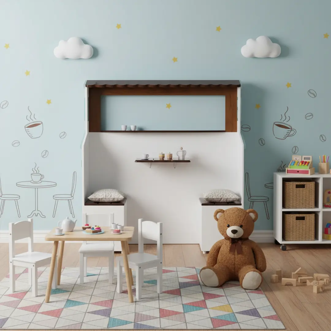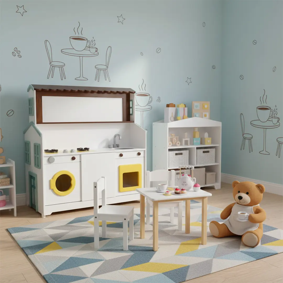 در یک سمت این مجموعه، یک آشپزخانه کامل کودکانه با اجزای واقعینما شامل اجاق گاز، فر و سینک طراحی شده و در سمت دیگر، یک کافه و میز سرو حرفهای قرار دارد تا کودکان بتوانند در نقش باریستا یا سرآشپز خلاق، دنیای خیالی خود را بسازند.